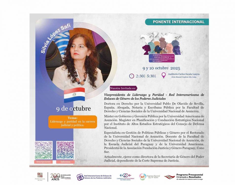 Cabe destacar que los días 9 y 10 de octubre del presente año, la doctora López Safi, a invitación de la doctora Elvia Barrios Alvarado, jueza de la Corte Suprema de Justicia del Perú y presidenta de la Red Interamericana, presentó en Lima, Perú, los resultados de su gestión durante el Congreso Internacional “Justicia social, igualdad y mujeres: homenaje a los 30 años de la Declaración de Beijing.”